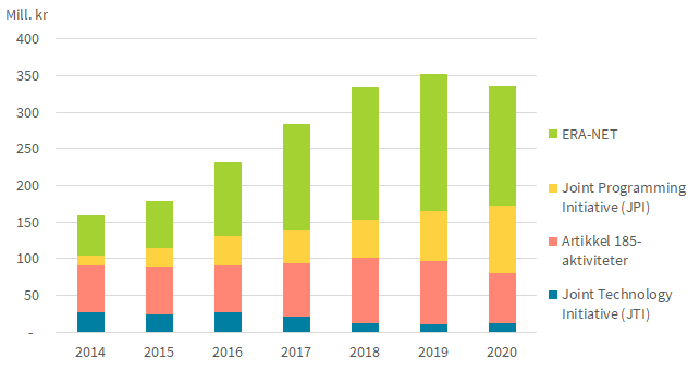 Nesten 1,1 milliarder kroner av dette er bevilget til ulike typer ERA-NET, inklusiv ERA-NET fra FP7 som fortsatt var aktive i perioden 2014–2020.