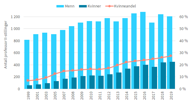 Professor II-stillingen er kjent som den minst likestilte stillingen ved universiteter og høgskoler. I 2019 var 33 prosent av professor I kvinner, mens kvinneandelen blant professor II var 27 prosent. Det er store forskjeller mellom fagområdene. Lavest andel kvinnelige professorer blant professor I finner vi innenfor teknologi med 14 prosent. Når det gjelder professor II innenfor teknologi, var kun 8 prosent kvinner i 2019. Motsatt hadde medisin og helsefag den høyeste kvinneandelen blant professor I, 46 prosent, mens professor II kun hadde 27 prosent kvinner. Her er det imidlertid store forskjeller mellom medisin på den ene siden og helsefag på den andre siden. Nær 70 prosent av professor II-stillingene var innenfor basal-medisin og klinisk medisin i 2019. Her var kvinneandelen 23 prosent. For professor II-stillinger i helsefag var kvinneandelen 49 prosent.