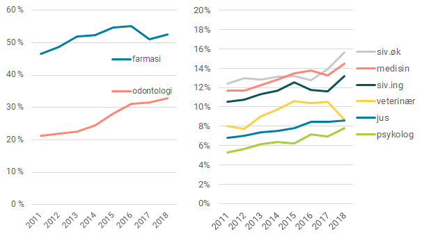Dersom vi vender blikket mot høyere grads utdanninger ser vi også her en svak økning i andelen innvandrere over tid, men større variasjoner mellom ulike utdanninger. Figuren under viser at det er særlig mange studenter med innvandrerbakgrunn i farmasi og i odontologi. I farmasi har studenter med innvandrerbakgrunn utgjort halvparten av studentene på studiet siden 2013, og før det var det nesten halvparten. Odontologi har hatt en kraftigere økning over tid, fra drøyt 20 prosent i 2011 til 2013, til over 30 prosent fra 2016. Figuren viser at studenter med innvandrerbakgrunn utgjør mindre enn deres andel av befolkningen i de seks andre lange høyere utdanningene vi ser nærmere på. I medisin og siv.øk.-utdanning er andelen imidlertid relativt nærme andelen i befolkningen: omtrent 12 prosent i 2011 og 15–16 prosent i 2018. Derimot er det få studenter med innvandrerbakgrunn som utdanner seg til psykolog eller jurist; her var andelene henholdsvis 5 og 7 prosent i 2011, for så å stige til omtrent 8–9 prosent i 2018. Det eneste faget der det er nedgang i andelen studenter med innvandrerbakgrunn er i veterinærutdanningen. Der var andelen over 10 prosent i 2014–2017, men er i 2018 nede på 9 prosent.