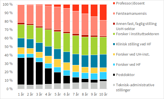 Av doktorgradsstudentene som har fullført doktorgradsutdanningen, var om lag halvparten registrert ved et universitet, en høgskole, et helseforetak eller i instituttsektoren (UF-institusjon) i 2019. Av disse var en tredjedel ved et universitet eller en høgskole. Figur 2 viser hvilke stillinger de tidligere doktorgradsstudentene som var tilsatt ved en UF-institusjon, innehadde et gitt antall år etter disputas.