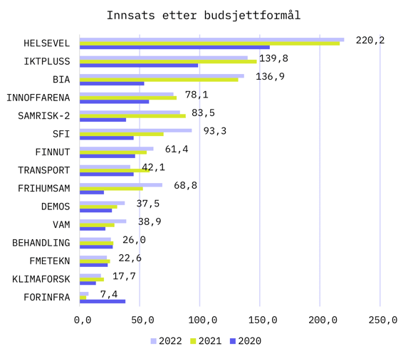 Figuren nedenfor viser de 15 budsjettformålene som fra 2020-2022 har hatt mer enn 50 mill. samlet, rangert etter innsats i 2022: