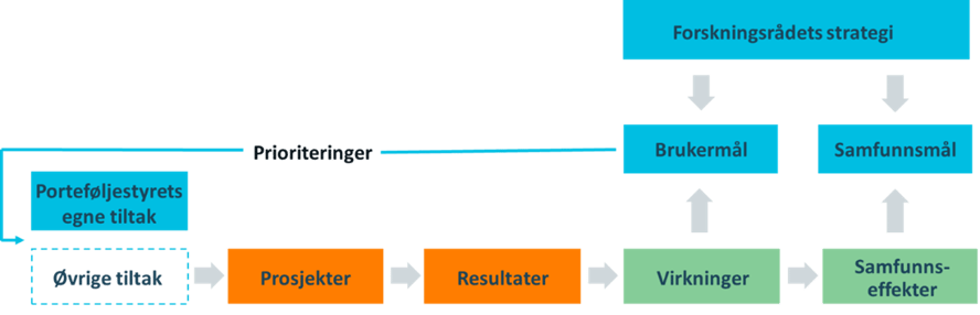 Investeringsmålene er forankret i Forskningsrådets strategi og består av samfunnsmål og brukermål i henhold til Direktoratet for økonomistyring[14] opplegg for statlig styring. Tiltak som settes i gang av Forskningsrådet skal resultere i et antall forventede virkninger og samfunnseffekter i henhold til en investeringslogikk (se figur 1). Se vedlegg 1 for en oversiktlig fremstilling av denne porteføljens investeringslogikk. Samfunnsmålene beskriver hvilke samfunnseffekter forsknings og innovasjonsinnsatsen skal innrettes mot.