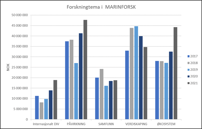 Frem til 2017 har forskning innenfor ØKOSYSTEM vært det temaområdet som den største innsatsen har rettet seg mot. Etterfulgt av temaområdet PÅVIRKNING som ser på hvordan ulik menneskelig aktivitet påvirker marine økosystemer. Disse to temaområdene er til dels overlappende siden all innsats knyttet til påvirkning også bidrar til økt forståelse av økosystemenes struktur, funksjon, eller variasjon og/eller endring. Den samlede innsatsen for de to temaområdene har vært stabil i perioden 2016 til 2020 på om lag 80 millioner kroner, men noe lavere i 2019. Med en utvikling mot at noe mer av innsatsen vris mot økosystempåvirkning de siste år.