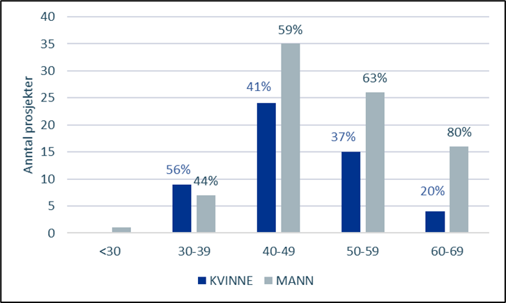 Figur 7 viser at det er relativt få prosjektledere som er under 40 år og at det er en overvekt av kvinner blant de yngste prosjektledere. Den største andelen av prosjektledere er i aldersgrupper 40-49 år, etterfulgt av aldersgruppen 50-59 år. Vi ser at menn utgjør den største andelen i de eldre aldersgruppene og med økende overvekt jo høyere aldersgruppe. Dette indikerer en pågående endring hvor vi kvinneandelen forventes å bli styrket i årene fremover etter hvert som nye yngre prosjektledere vil komme til.