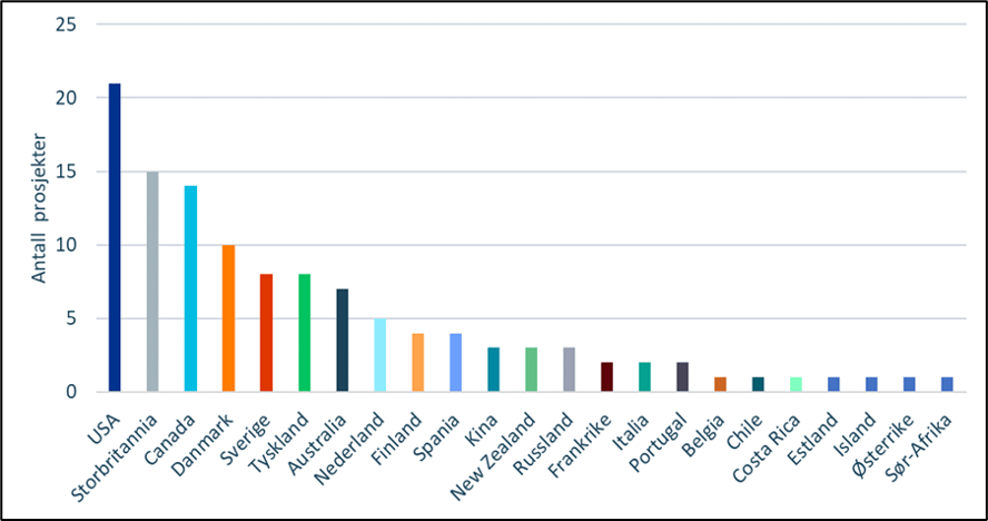 Figur 8 viser at USA er det viktigste samarbeidslandet for norske marine forskere, etterfulgt av Storbritannia, Canada og Danmark. I 2021 var samarbeidsavtaler mellom norske prosjektledere og FoU-institusjoner fra 24 ulike land.