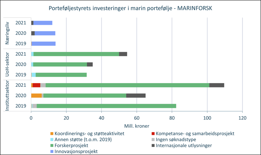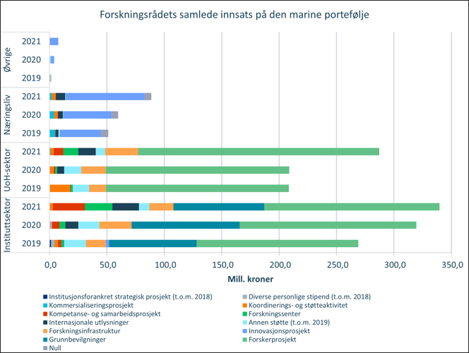 Den totale innsatsen i Forskningsrådet i den marine porteføljen er på 723 mill. kroner i 2021, inkludert grunnbevilgning til instituttsektoren. Forskerprosjekter utgjør den største andelen av prosjekter i den marine porteføljen i Forskningsrådet med en samlet innsats på 363 millioner kroner (tilsvarende 50% av totalinnsats) i 2021. Innenfor den totale marine porteføljen av forskerprosjekter har det vært en relativt jevn fordeling mellom bidrag fra instituttsektoren og UoH-sektoren de senere årene. UoH-sektoren har styrket seg og er størst i 2021. Det er også flere viktige nasjonale infrastrukturer innenfor det marine området og i 2021 utgjør disse om lag 7% av total innsats tilsvarende 50 mill. kroner. Volumet av Innovasjonsprosjekter i næringslivet har økt siste år utgjør 69 mill. kroner i 2021 (9,5% av total innsats).