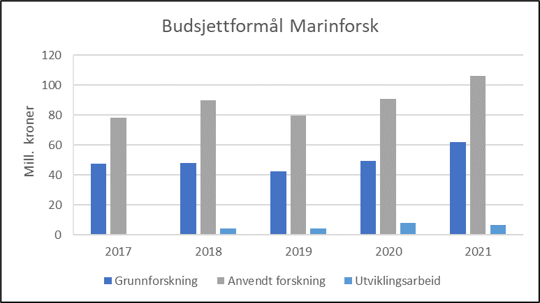 For den marine porteføljen er den målrettede innsatsen gjennom MARINFORSK hovedsakelig finansiert av Nærings- og fiskeridepartementet med ca. 112 millioner kroner etterfulgt av Klima- og miljødepartementet (36 mill. kroner), Kunnskapsdepartementet (8 mill. kroner) og Olje- og energidepartementet (3 mill. kroner) totalt om lag 160 millioner kroner i 2021.