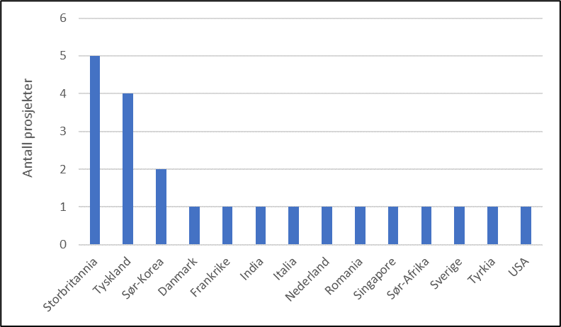 Figuren viser at der er et begrenset antall prosjekter med internasjonalt samarbeid i den nasjonalt finansierte forskningen gjennom MAROFF. Norske maritime bedrifter og forskningsmiljøer samarbeider derimot i betydelig grad internasjonalt gjennom EU-finansierte prosjekter som beskrevet ovenfor.