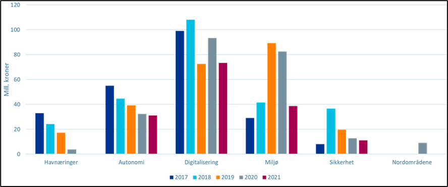 Autonomi og digitalisering er prioriterte områder som ble introdusert i 2017 basert på Maritim21. Som forventet var det en stor søkning til disse områdene første gang de ble utlyst i 2017, noe som fortsatte i de etterfølgende årene. Dette gjenspeiler næringens og forskningsmiljøenes behov og interesse for disse områdene.