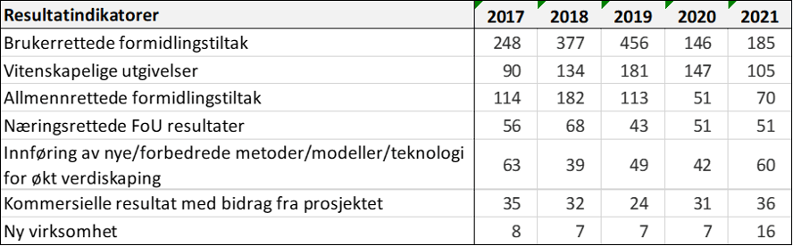 Resultatindikatorene for 2021 viser en nedgang i vitenskapelige publikasjoner og en økning i innovasjonsrelaterte resultater.