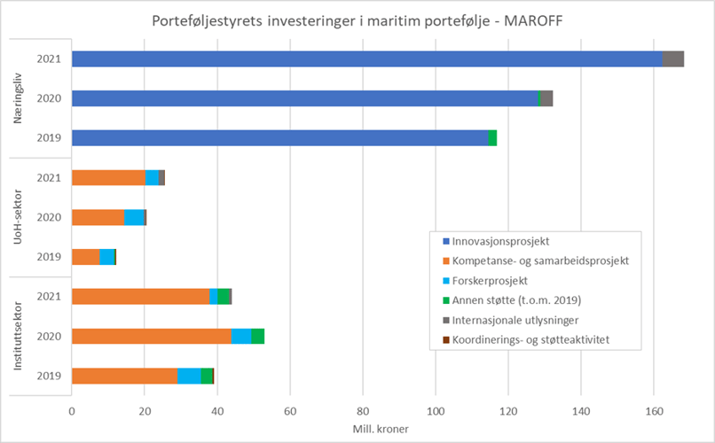 For den maritime porteføljen er den havporteføljens egne investeringer gjennom budsjettformålet MAROFF finansiert av Nærings og fiskeridepartementet, og tildelingen i 2021 var 171 mill. kroner.