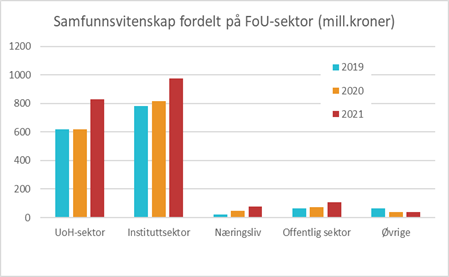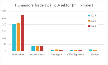 Figurene 6 og 7 viser Forskningsrådets bevilgninger til henholdsvis humaniora og samfunnsvitenskap fordelt på forskningsutførende sektor. Øvrige omfatter offentlig sektor og div. organisasjoner og utenlandske institusjoner.