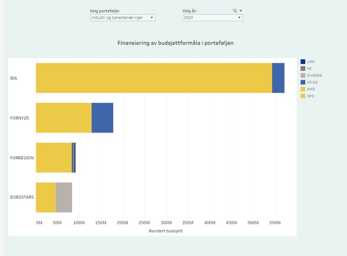 Det er i hovedsak NFD som har finansierer for de åpne næringsrettede virkemidlene (BIA og EUROSTAR) og tiltakene for kommersialisering (FORNY og STUD-ENT). KD delfinansierer (ca. 25 prosent) kommersialiseringsinnsatsen (FORNY). KMD finansierer de regionalt rettede tiltakene (FORREGION) og KD delfinansierer regional tilstedeværesele.