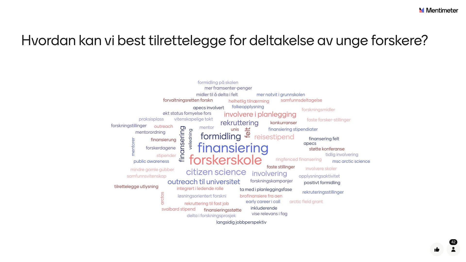 Deretter ble det åpnet for innspill gjennom responsverktøyet Mentimeter, hvor deltakerne bidro med mange gode idéer og refleksjoner rundt veien frem til IPY5. Resultatet ser du i ordskyene under.