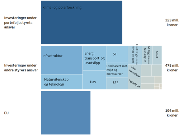 Forskningsrådets totale klima- og polarportefølje var på nær 1 mrd. kroner i 2021. Dette inkluderer finansieringen gjennom Forskningsrådet og EU på henholdsvis 801 og 196 mill. kroner (figur 1). Nær 20 prosent av budsjettet består altså av EU-prosjekter. EU-midlene dekker den norske andelen fra EU i prosjektene, men disse EU-prosjektene har en langt større total ramme. Norge får dermed en retur av forskningsresultater som er langt større enn tildelingene skulle tilsi.