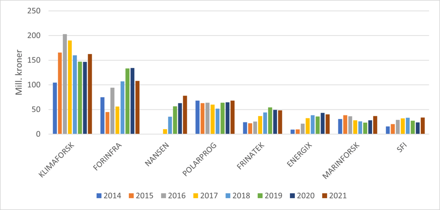 Det er få klare trender for de største av Forskningsrådets budsjettformåls bidrag til klima- og polarporteføljen for perioden 2014-2021 (figur 4), men det har i hovedsak vært en økning hvis man sammenligner starten og slutten av perioden. KLIMAFORSK har for perioden hatt det største bidraget hvert år. Det er også verdt å merke seg det betydelige bidraget fra forskningsinfrastruktur (FORINFRA). Arven etter Nansen (AeN) startet opp med et forprosjekt i 2017. Den forholdsvis store aktiviteten i AeN i 2021 sammenlignet med de to foregående årene er mer av administrativ art grunnet utsettelser av tokt, oppstart av stipendiater og andre utsettelser grunnet koronapandemien. POLARPROG har nærmest vært uendret i perioden.