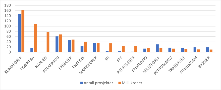 I 2021 bidro 16 budsjettformål med mer enn 10 mill. kroner til den totale klima- og polarporteføljen (Figur 3). Som tidligere år er det KLIMAFORSK som med 163 mill. kroner har størst budsjett til klima- og polarforskningen. Forskningsinfrastruktur (FORINFRA) bidro med 108 mill. kroner, og aktiviteten NANSEN (Arven etter Nansen) og budsjettformålet POLARPROG har bidrag til porteføljen på henholdsvis 78 og 68 mill. kroner. Andre viktige bidrag er fra budsjettformålet ENERGIX, mens frie forskningsprosjekter innenfor matematikk og naturvitenskap (FRINATEK) også er en av de større bidragsyterne til porteføljen. Klima- og miljøforskningen må sees i sammenheng. Dette gjøres blant annet gjennom MARINFORSK for hav og MILJØFORSK for land.