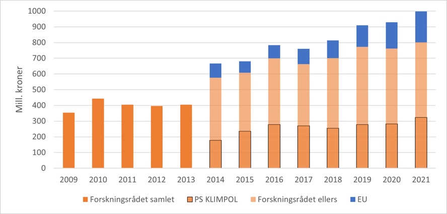 Finansieringen av klima- og polarporteføljen gjennom Forskningsrådet har økt fra 354 mill. kroner i 2009 til 801 mill. kroner i 2021. Konsumprisindeksen har i perioden steget med omtrent 29 prosent slik at 354 mill. kroner i 2009 tilsvarer 457 mill. kroner i 2021. Fra 2014 til 2021 har finansieringen fra EU økt med 117 prosent, økningen innenfor porteføljestyrets ansvar er 80 prosent, mens økningen fra Forskningsrådet ellers er 24 prosent. I samme periode er økningen i konsumprisindeksen ca. 18 prosent, så det er særlig innenfor "Forskningsrådet ellers" en begrenset økning i tildeling til klima- og polarforskningen.