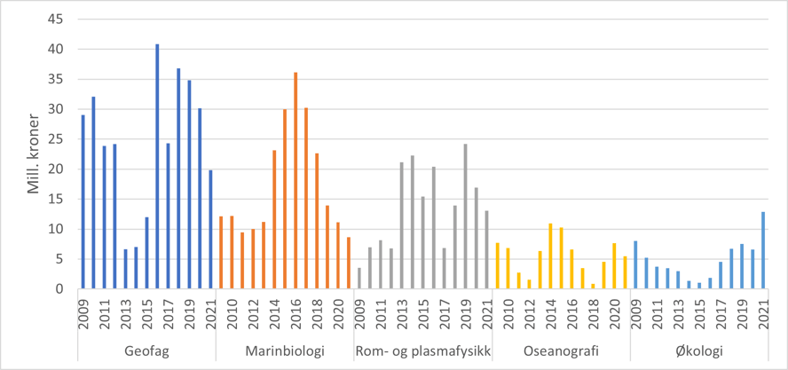 Både for geofag og marinbiologi er det en nedgang i Svalbardporteføljen de senere årene. Geofag har en svært variabel trend i perioden, med liten andel av finansieringen i årene 2013-2015 for deretter raskt å øke i 2016 for så å ha en relativt jevn nedgang igjen frem til 2021. Finansieringen av geofag i 2021 på Svalbard var på 20 mill. kroner.