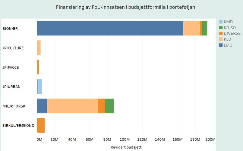 De viktigste finansierende departementene er Landbruks- og matdepartementet (LMD), Klima og Miljødepartementet (KLD) og Kunnskapsdepartementet (KD). Forskningsmidlene for jordbruk og matindustri bidrar betydelig til porteføljen med egne investeringer, samt en rammebevilgning til Naturmangfold og miljø med et årlig beløp på 6 mill. kroner. Et eget budsjett for tverrgående satsninger på bioøkonomi finansieres av LMD i samspill med midler fra Nærings- og fiskeridepartementet (NFD). Budsjett for tverrgående satsinger på lavutslipp (fra tildelingsbrev) finansieres av KLD. Midlene lyses ut i tråd med tildelingsbrevet fra det enkelte departement for det enkelte budsjettformål, noe som reflekteres i bredden av porteføljens investeringsmål og tiltak.