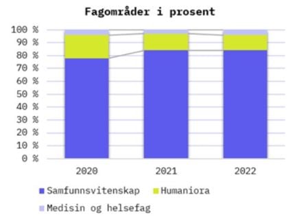 Prosjektene som porteføljestyret selv finansierer har noenlunde samme andel humaniora i 2022 som året før, 12 %. Samtidig går det nå langt flere kroner til fagområdet enn tidligere år - 34 mill. kr i 2022 mot 25 og 23 mill. kr i 2020 og 2021. Dette er i tråd med utviklingen ellers i Forskningsrådet; andelen humaniora er stabil eller svakt økende, men gitt økningen i investeringene går nå langt mer forskningsmidler til fagområdet. Det er særlig i den allmenne kulturforskningen og delvis på det kulturpolitiske området at humaniora gjør seg gjeldende i porteføljen. I tråd med Forskningsrådets opptrappingsplan er det rom for mer humaniora i porteføljens egne investeringer på arbeids- og velferdsfeltet. Innenfor porteføljestyrets største budsjettformål (VAM), som har ansvar for forskning på arbeid og velferd, er andelen fortsatt svært liten (1,3 % i 2022).