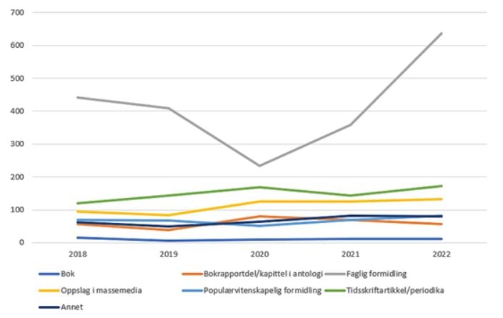 En oppmerksomhet mot forskningens samfunnsnytte og anvendelse innebærer blant annet at det er viktig å legge til rette for ulike former for formidling og kommunikasjon av forskningen til brukere og offentligheten. Forskningsrådet har flere tiltak og krav til prosjektene for å støtte opp under bruken av forskning. Porteføljestyret lyser bl.a. ut midler til formidling av kulturforskning. Videre er søknadenes publiserings- og formidlingsplaner en viktig del av faglig vurdering. Formidling er i hovedsak et ansvar som ligger hos prosjektene og deres vertsinstitusjoner, som sammen med brukere av forskningen også har ansvar for anvendelse og implementering av forskningens resultater. Planer for bruker- og allmennrettet formidling og vitenskapelig publisering er en viktig del i prosjektsøknadene og den faglige vurderingen av disse. Diagrammet under viser formidlings- og publiseringsresultater fra prosjektene som er finansiert av porteføljen for Velferd, kultur og samfunn i perioden 2018-2022 (basert på tall fra Cristin). Her ser vi at publisering har holdt seg relativt jevn fra år til år. Prosjektene rapporterer høyest antall aktiviteter innenfor faglig formidling, som inkluderer bl.a. fagbøker, lærebøker, faglige kapitel, seminarer, vitenskapelige foredrag, leserinnlegg og kronikker. Ikke overraskende var det en nedgang i denne typen aktiviteter i covid-året 2020.