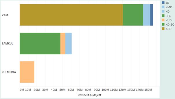 Figur 3 viser finansieringskildene for de tre budsjettformålene som porteføljestyret for Velferd, kultur og samfunn har ansvaret for.