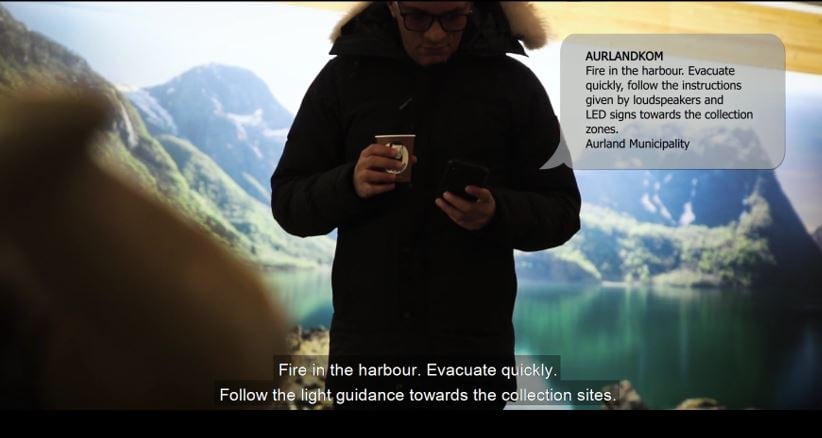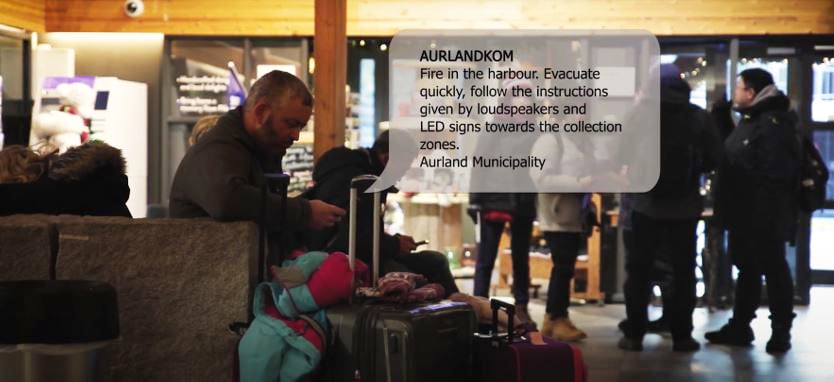 -Flåm var et veldig egnet sted for å teste systemet. I turistsesongen er det tusenvis av mennesker på et lite område og det er mange turister som ikke forstår norsk. Scenariet var en storbrann i batteriladestasjonen til en båt som lå til kai i sentrum.